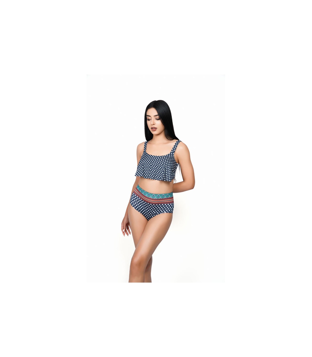 Découvrez notre bikini assorti à imprimé petits pois, avec un top volant et un slip taille haute.