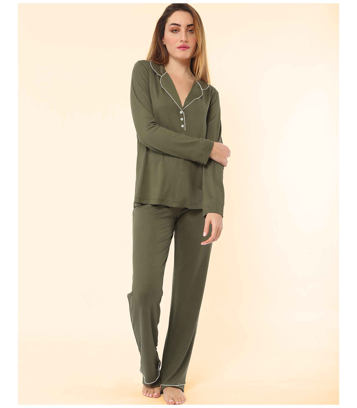 Cet ensemble pyjama allie confort et élégance avec son motif point pico subtil. Confectionné en viscose de haute qualité, il offre une douceur exceptionnelle et une légèreté agréable sur la peau