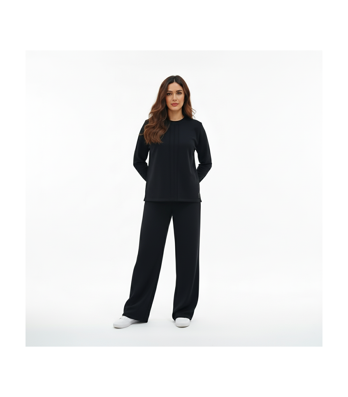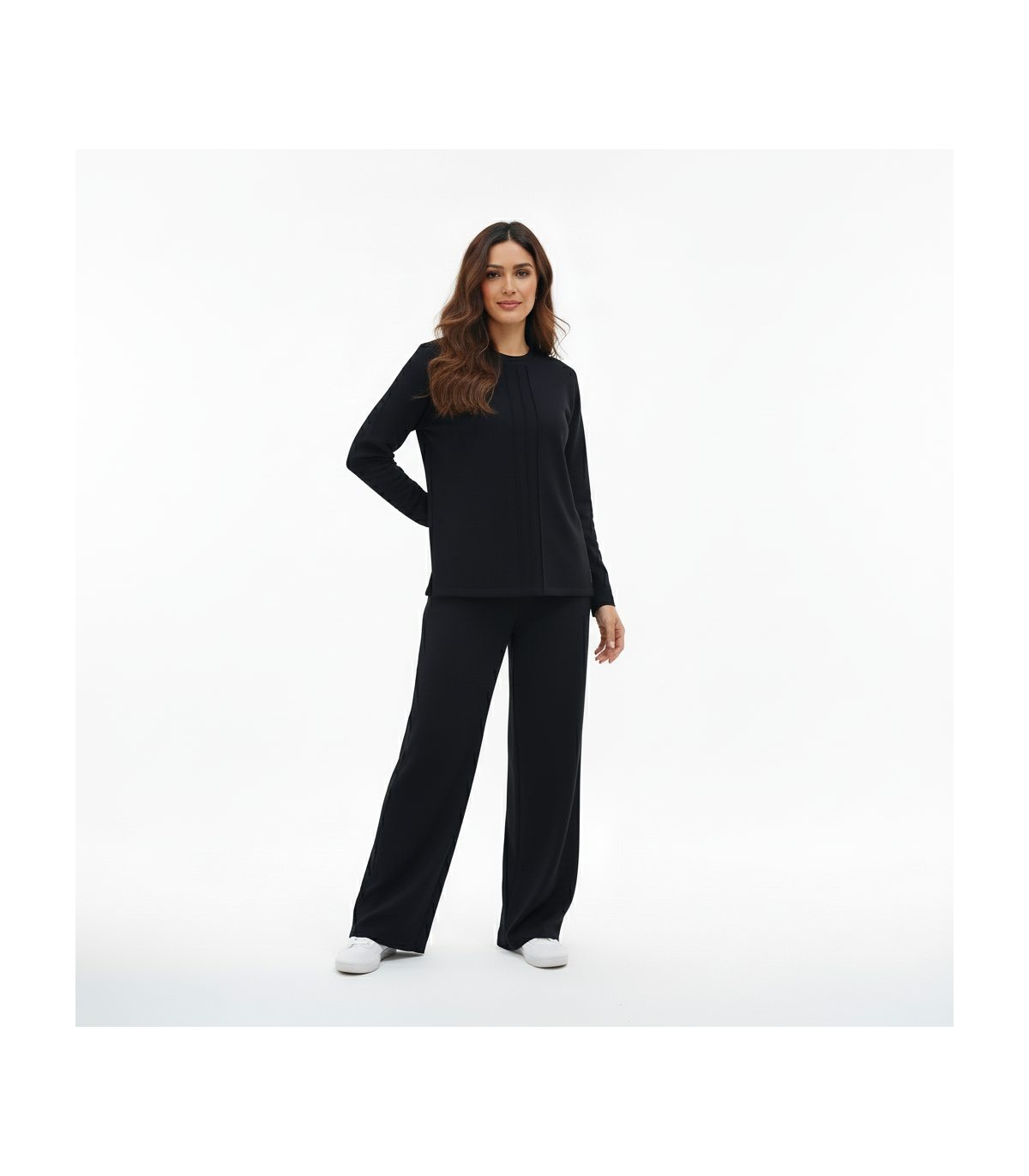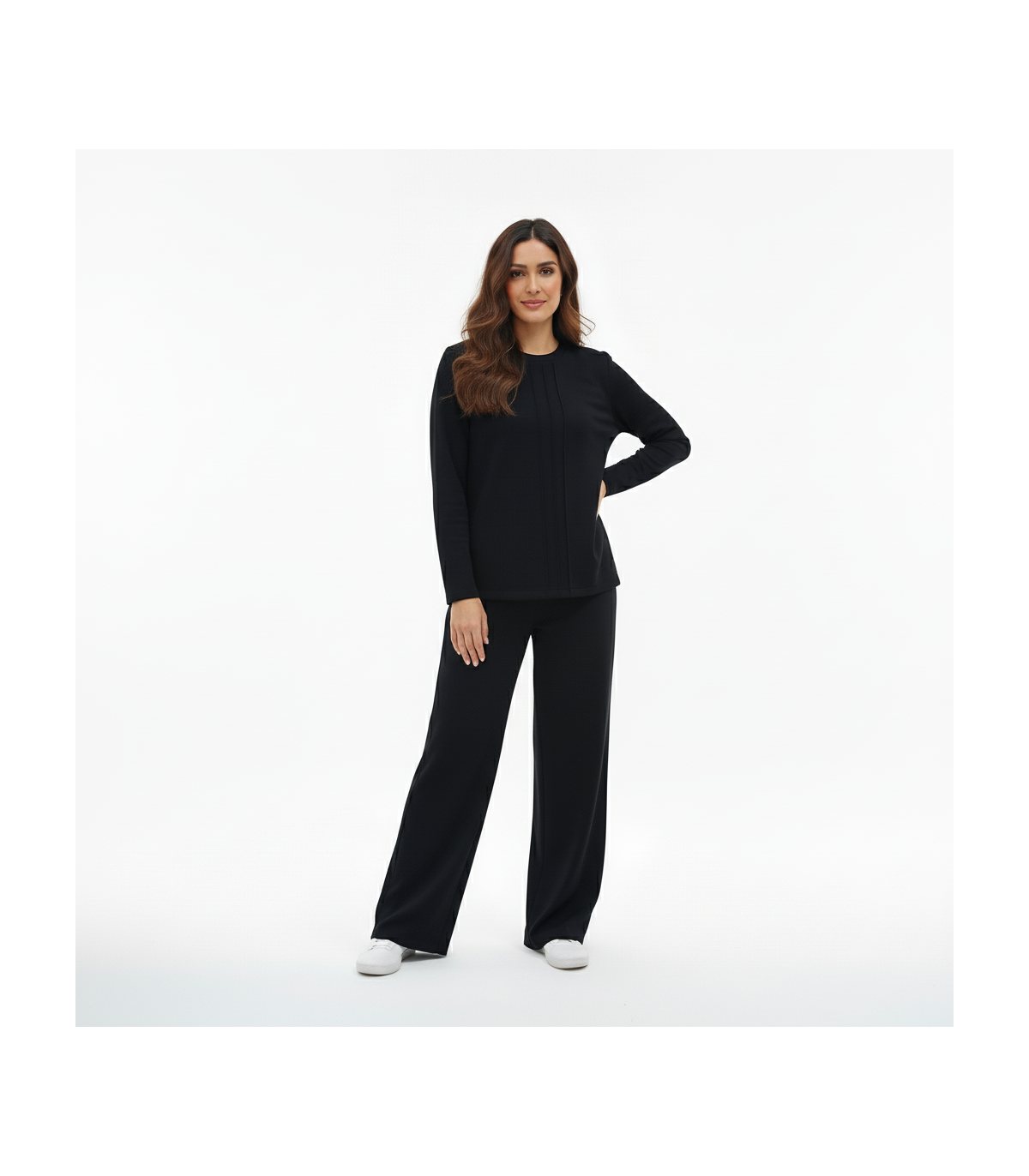 Optez pour le parfait équilibre entre confort et élégance avec cet ensemble molletonné composé d’un pull classique et d’un pantalon large. Confectionné dans une matière douce et agréable au toucher, il offre un confort optimal tout au long de la journée.